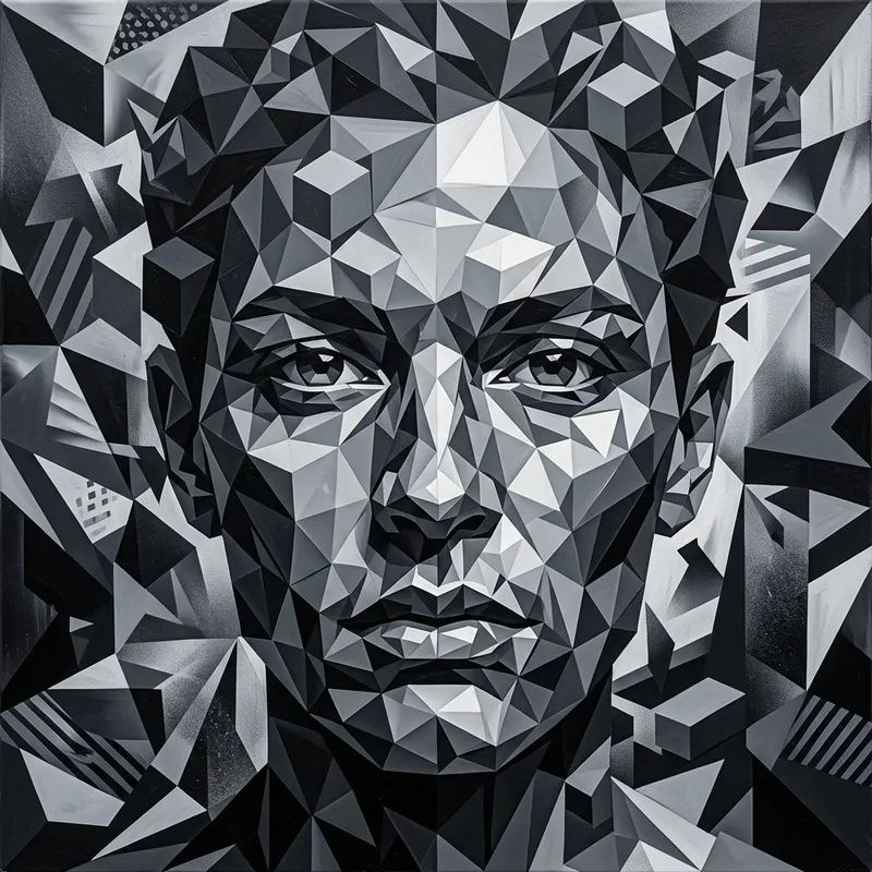 Create an abstract art piece depicting a face constructed from geometric shapes consisting mainly of cubes and triangles. The artwork should have a monochromatic color scheme with various shades of black and white.