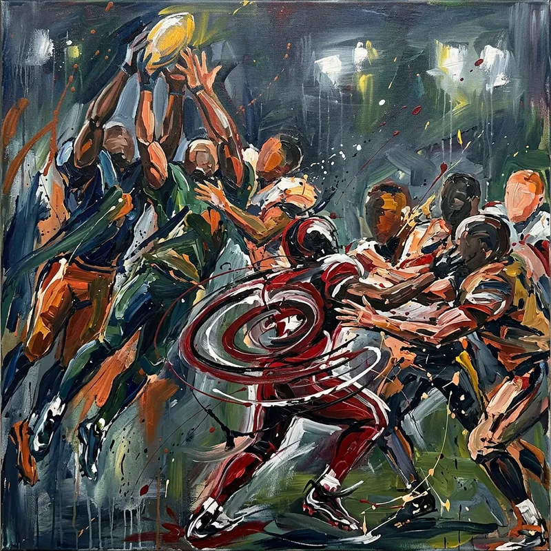 An abstract art piece depicting football players in action. The image shows diverse football players of different descents, such as Black, Caucasian, Hispanic, Middle-Eastern, and South Asian. In some parts of the image, there are muscular men aggressively leaping in air to catch the football. Others are agilely avoiding being tackled, demonstrating admirable dexterity and strength. The abstract style invites you to experience the movement, emotions, and tense energy of the game in a way that's less focused on realism and more on the feelings that the game inspires.