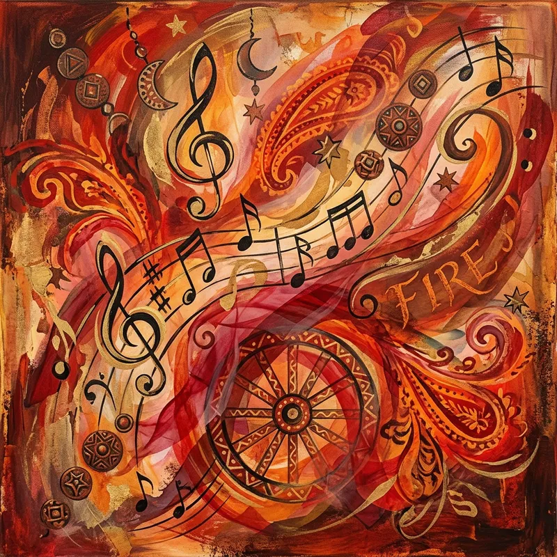 An abstract representation of gypsy charm intermixed with music, without any human figure. This scene should capture the idea of music notes blending with symbols and elements representative of gypsy culture. The color palette should be warm, with the dominant themes of the image being red and orange to symbolize fire. The word 'FIRE' should be subtly incorporated into the design.