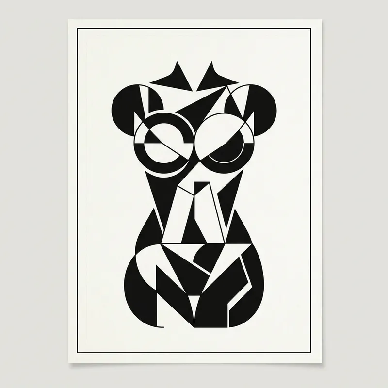 Create a black and white image that portrays a abstract representation of a female torso, composed entirely of geometric shapes. The design should consist of simple and complex forms such as circles, triangles, rectangles, and other polygons, intricately positioned to form the body contours. Let this art piece evoke a sense of simplicity and minimalism.