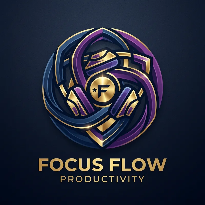 An abstract logo consisting of creatively arranged headphones. The image should portray the ideals of focus and productivity. The headphones might be designed in an intricate pattern showing connectivity symbolizing concentration, while bold lines and sharp angles might suggest efficiency and productivity. The color palette can include dark blues and purples to evoke a sense of calm and focus. Use gold accents for a touch of elegance and sophistication.