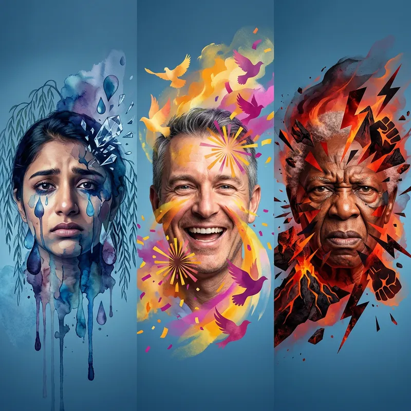 Create an envisioning of human emotions abstractly portrayed. Imagine a few faces showing different emotions like joy, sadness, and anger. These faces belong to people of different genders, with one being a middle-aged Caucasian male, another being a young South Asian female, and one elderly Black person. Each emotion is exaggerated and morphed into abstract shapes, color swaths, and symbolic imagery to convey the full essence of their feelings. The background is a serene shade of blue to offer a contrast to these emotive outbursts.