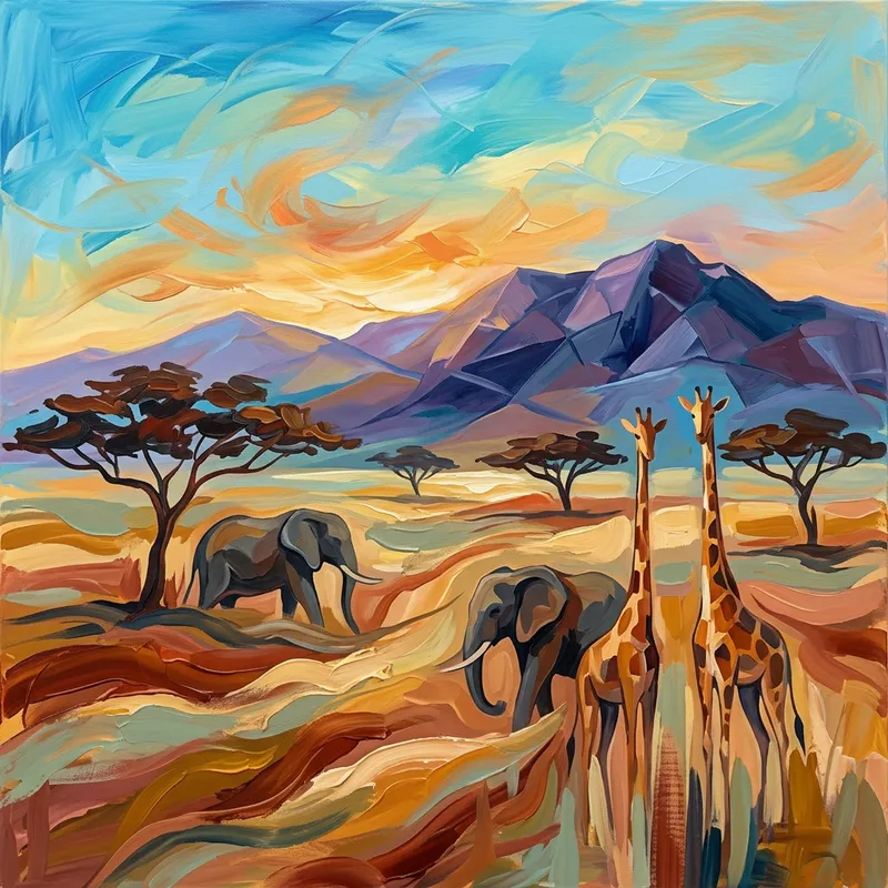 Visualise a breathtaking Kenyan landscape in an abstract fashion. Imagine rolling savannas under the radiant African sun, dotted with acacia trees standing alone and proud. The backdrop is dominated by majestic mountains, their peaks reaching into the bright blue skies. Meanwhile, the presence of wildlife such as elephants and giraffes, rendered in an abstract form, adds a unique charm to the scene. Let colours merge and shapes transition fluidly into one another to truly embrace the essence of abstraction.