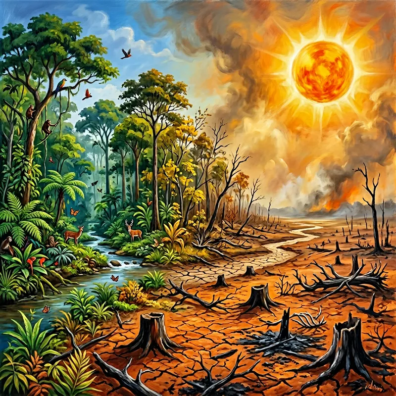 An abstract representation of global warming. The scene illustrates an extraordinary transition from a vibrant green forest, brimming with biodiversity at the far end, to a barren and scorched land on the near side. The transition vividly depicts the adverse effects of climate change. Majestic trees with dense foliage gradually recede, replaced by parched branches and burnt stumps. A bright sun hangs in the sky, cruelly powerful and relentless. This imagery serves as a stark warning of our planet's potential future if global warming is not curtailed.