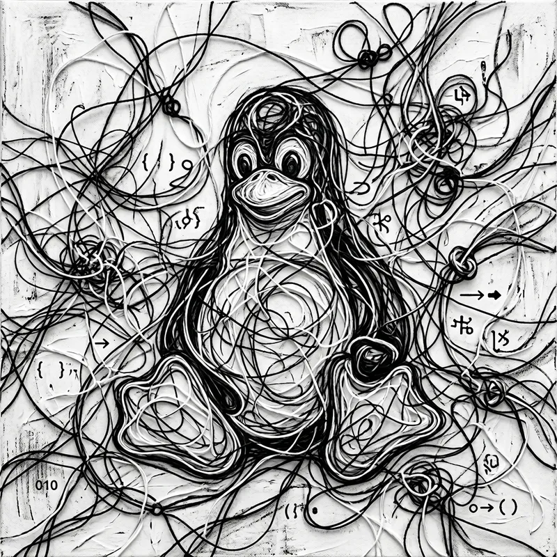 A piece of abstract art inspired by the concept of Linux. The image should contain elements that symbolize open-source software and the sharing of information. This could be represented using intertwined threads in the abstract piece that represent the links between the users and developers. The color scheme should be minimalistic, with prominent use of the penguin black and white, to evoke the association with Linux's iconic mascot, Tux the Penguin.