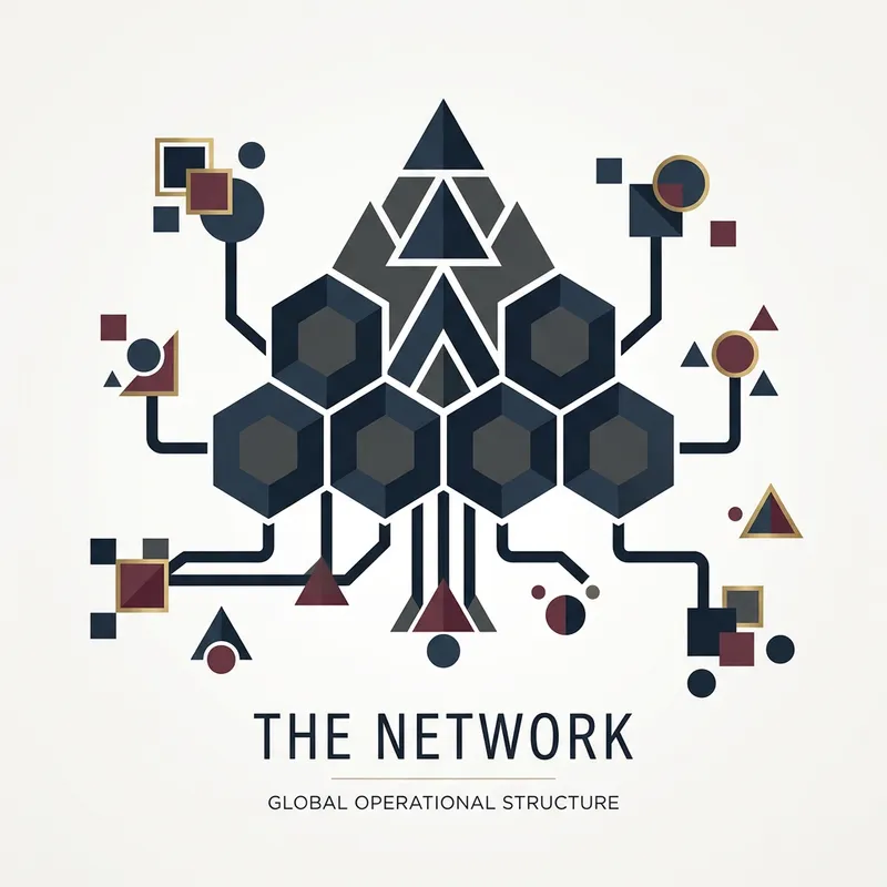 A minimalistic graphic illustration showing an abstract representation of the concept of a large organization involved in illicit activities, without specifically denoting any geographical location such as Mexico, or making any specific references to drug cartels. The design could use geometric shapes and a restricted color palette to portray power and influence, while still maintaining a clean and simple aesthetic.