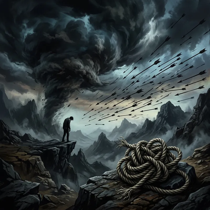 An abstract representation of depression, anxiety, and stress. Depict depression as a dark, engulfing storm cloud, anxiety as sharp arrows rapidly being fired at an unseen target, and stress symbolized as a tightly knotted rope. Put all these elements together in one ominous and surreal landscape.
