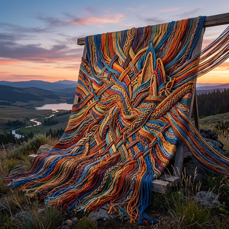 Design an abstract representation that speaks to diversity, equity, and inclusion. Imagine a large tapestry, woven with different threads. Each thread represents a different descent such as Caucasian, Hispanic, Black, Middle-Eastern, South Asian. The threads entwine and overlap, creating a rich, colorful texture representing human unity. Some threads rise above the others in places, symbolizing equity and the aim to uplift everyone. For inclusion, picture threads coming from the edges and interweaving into the center of the fabric, symbolizing the integration of all people into a singular, vibrant tapestry. The tapestry is draped across a peaceful and quiet landscape during the twilight hours, bathed in the soft glow of the setting sun, further reinforcing the sense of unity and peace.