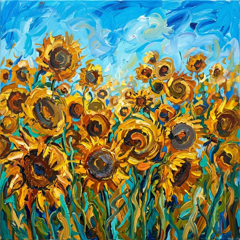 Create an image of a field of sunflowers interpreted in an abstract style. The sunflowers should appear in vibrant hues that range from golden yellow to deep brown, contrasting with a bright blue sky. The image should capture the essence and energy of the sunflowers, rather than striving for realistic detail. Think in terms of bold shapes, exaggerated proportions, and rhythmic patterns that bring out the beauty and vitality of these flowers in a unique and non-literal way.