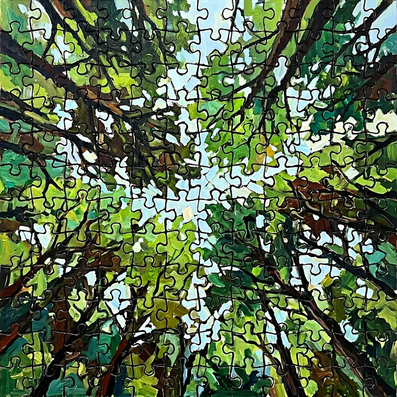 An abstract interpretation of treetops. Picture a series of overlapping tree canopies in a dense forest. The colors should be earthy yet vibrant, ranging from emerald and lime greens to dark, shadowy browns and blacks. Patterns formed by the gaps between the branches and leaves should give the impression of a jigsaw puzzle, with fragments of the sky peeking through. This visual play between light and shadow contributes to the abstract nature of the image.