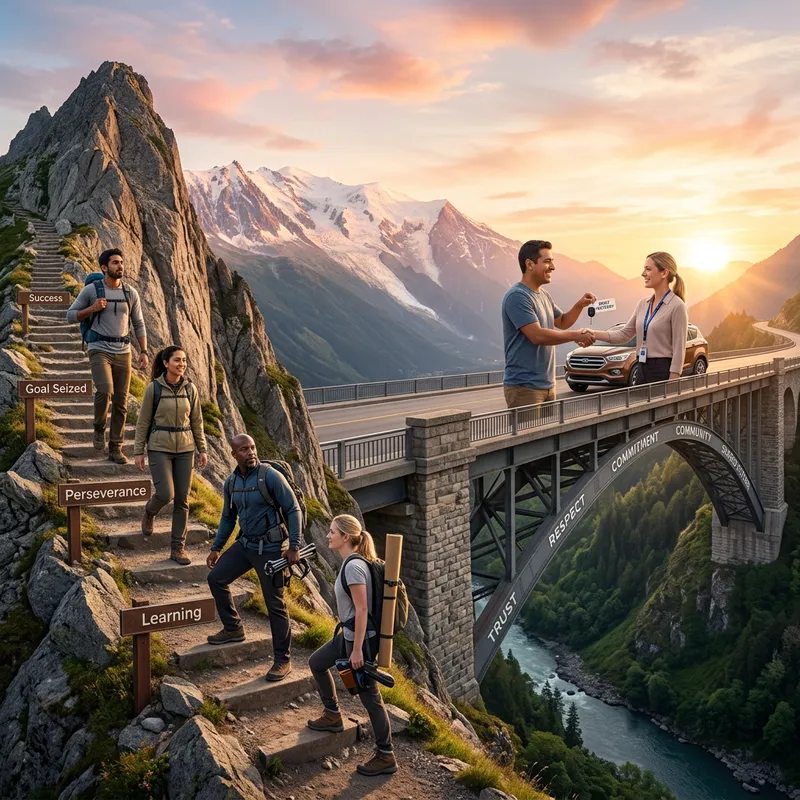 Visualize an inspirational image that metaphorically represents achieving personal and professional goals. Consider a steep mountain path with each step as a reminder of the opportunities seized; grueling yet rewarding, tensioned by competition yet gifted with the beauty of the climb. Picture diverse climbers to represent inclusivity: a South Asian male athlete leading, followed by a Middle Eastern female entrepreneur, a Black male scientist, and a White female artist, all persevering and marking their trail. Now envision adjacent to this scene, a symbolic image of building relationships. A massive bridge, each segment representing trust built. On the bridge, there's a Hispanic male customer receiving a temporary car key from a Caucasian female employee, symbolizing the 'spot delivery' process. The overall scene connects goals and relationships, under a sky lit by a Mother’s day sunrise, portraying love and respect.