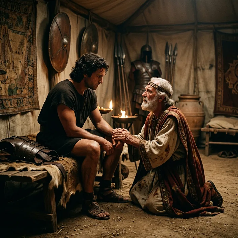 Priam, a weary and aged king, draws a parallel between Achilles and his own father, emphasizing that both are aging men whose sons are entangled in conflicts. He stirs Achilles' empathy by mentioning the anticipation and hope of Achilles' father to see him return from Troy. The scene is set in the ancient times of the Trojan War, showcasing the rustic setting and the intense emotional conversation taking place.