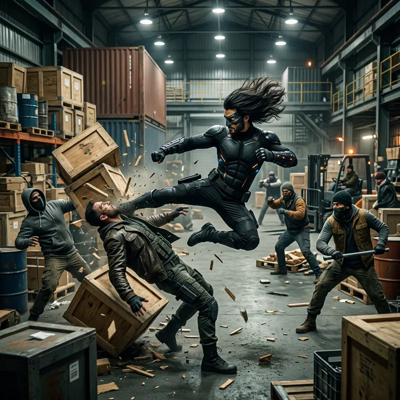 Middle-Eastern Male Superhero Battles Villains in Warehouse