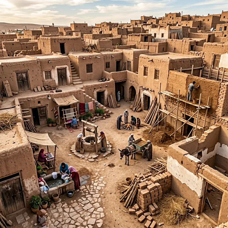 depict an old city scene focused around a central courtyard. The buildings should primarily be single-story, constructed from adobe with shared partition walls, offering an inward-facing life. The facades should be blank, indicating a level of privacy. Despite being closely grouped together, each building should be situated on an irregularly shaped lot. Additionally, show indications of continual construction and adaptation, suggesting evidence of progressive accumulation and reconstruction at the same site. Enhance the theme of urban evolution and adaptation over time.
