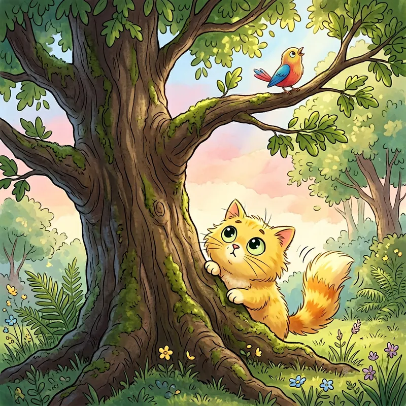 Create an adorable 2D cartoon image of a small, fluffy, yellow cat with big green eyes and an expressive face. The cat is curiously peering from behind an animated old oak tree, its tail waving slowly in the air. High up on a branch, a red and blue bird is perched, unaware of the cat's gentle stalking. The scene is enveloped by a soft, pastel morning sky, illuminating the natural setting.