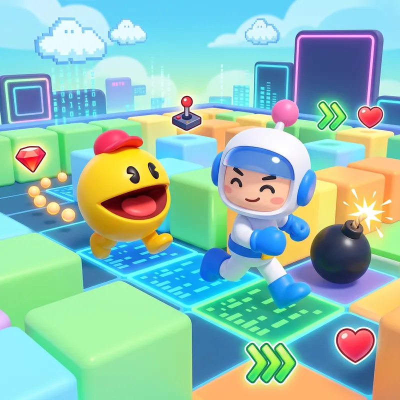 Adorable 3D game scenery comprising two playful characters – one a spherical entity with a large mouth, exuding the charm of early arcade games and the other, a humanoid figure wearing a helmet and gloves, recognizable from maze-based strategy games. The scene showcases interactions using spherical explosive devices and various power-up items scattered around a vibrant digital landscape.