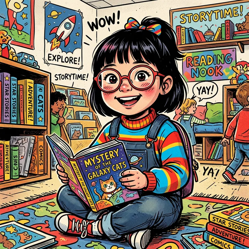 An adorable 5-year-old Asian girl with glasses, holding a book in her hand. The scene encapsulates the essence of vibrant comic book illustrations, utilizing bright primary colors while highlighting her wide-eyed curiosity. The image should try to emulate the particular aesthetics of a candid moment captured with a smartphone camera, bringing out her nerdy vibes.