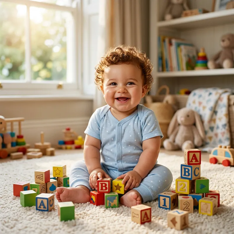 An adorable baby boy, with chubby cheeks and a heartwarming smile. He has tightly curled auburn hair and sparkling dark brown eyes. He is clad in a soft, light-blue onesie, with tiny white stars scattered across it. The baby boy is sitting on a plush carpet, surrounded by colorfully painted wooden blocks, some scattered, some piled together. A sunbeam filters through the window, casting a soft glow on the cheerful scene.