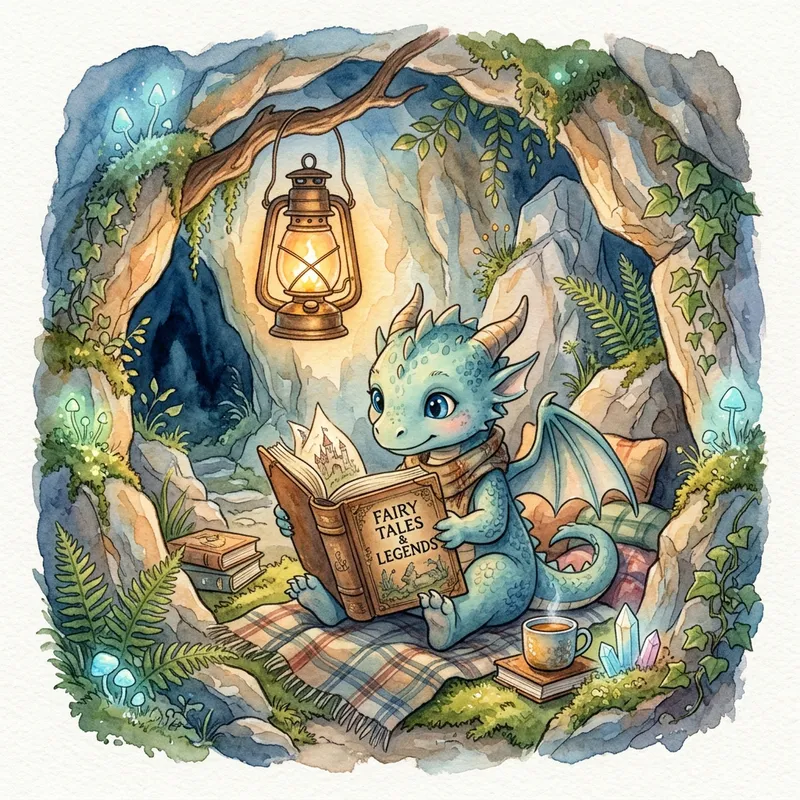 A charming baby dragon, characterized by its adorable blue eyes, engrosses itself in reading a book. The book reading takes place under the warm light of a lantern, illuminating the surroundings. The setting is a cavern subtly embellished with a touch of greenery, conveying a sense of natural emergence amongst the rocks. The vivid scene is presented in a storybook manner reminiscent of classic watercolor illustrations, where nuances of color bleed into each other to tell a captivating tale.