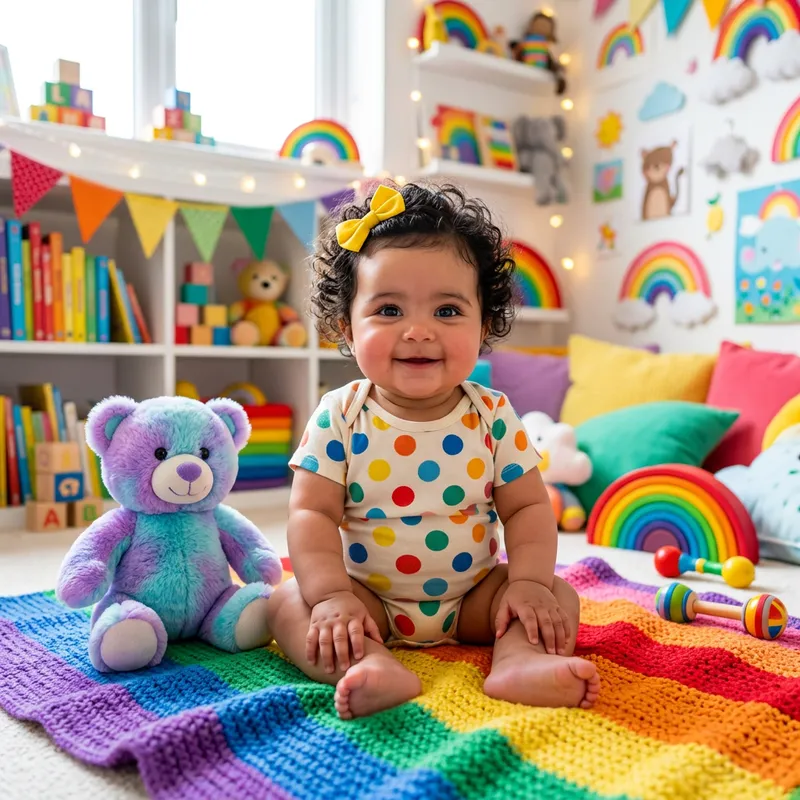 An adorable baby with expressive eyes and chubby cheeks is sitting up on a soft, vibrant-colored blanket. The infant is wearing a colorful polka dot onesie that accentuates their innocent charm. Their black, curly hair is adorned with a bright yellow bow. A stuffed animal is nearby, a fluffy teddy bear in violet and turquoise hues. The scenery is bursting with a rainbow of colors, adding a joyful, energetic ambiance to the environment.