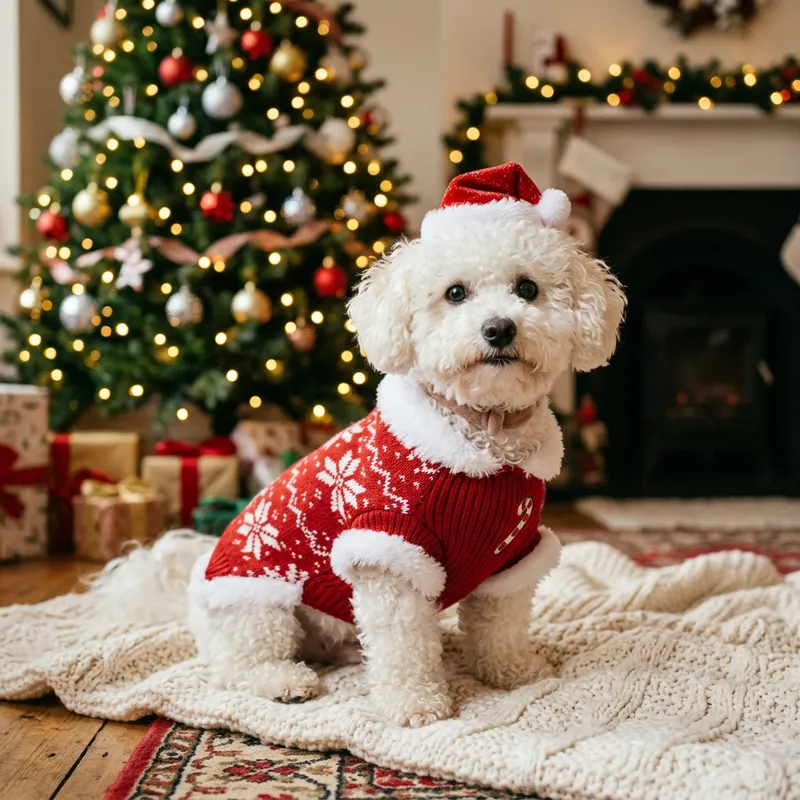 A photo of an adorable Bichon Frise dog wearing a Christmas costume.