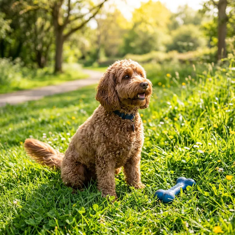 An adorable brown dog of medium size with playful eyes and soft, curly fur. It's sitting comfortably on green grass, looking curiously into the distance. Its tail is wagging gently, demonstrating its content and joyful mood. Near the dog, there's a blue chew toy, suggesting that the dog is in the middle of a fun play session, with the warm yellow sun casting its light on the happy scene.