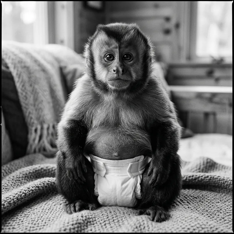 A chubby monkey with a diaper, predominantly in black and white hues. The monkey's fur is visibly thick and silky. Its eyes hold an endearing innocence, making it look adorable. The diaper it wears is fastened securely around its middle, demonstrating the humor of the situation. The entire image is done in varying shades of black, white, and greys creating a picturesque monochromatic portrait of this delightful creature.