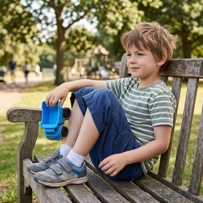 An eight-year-old Caucasian boy is seen wearing a loose-fitting, comfortable pair of shorts and holding a blue toy in his hand. His outfit is casual, and he is sitting comfortably with his knees up