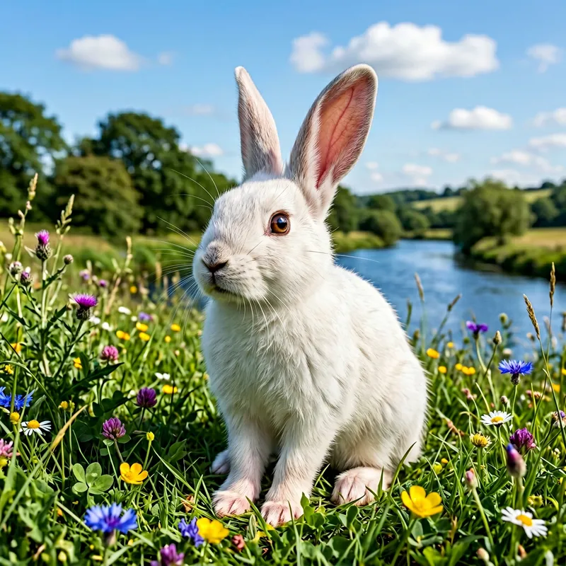 A detailed image of a female rabbit. She is sitting in a lush green field, her fur is soft and white. Her ears are long and standing upright, eyes are large and brown, gleaming with curiosity. She's alert, nose twitching as she senses her surroundings. Delicate pink paws are visible as she sits on her haunches. In the background, there's a peacefully flowing blue river and an array of colorful wildflowers. The sky is clear, with just a few fluffy white clouds creating an idyllic, serene environment.