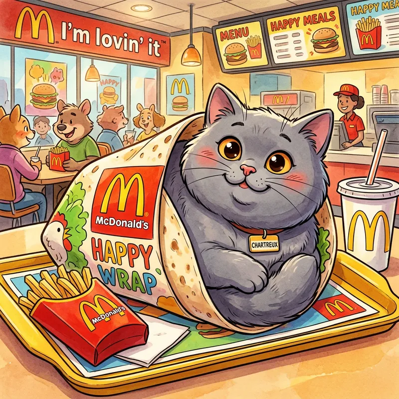 An illustration of a chunky male Chartreux cat of grey color nestled inside a McDonald's wrap. The entire scene is depicted in a style characterized by exaggerated endearing features, vibrant colors, and anthropomorphic elements, reminiscent of the era of traditional animation.