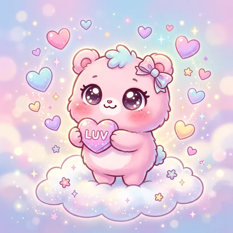 Create an adorable kawaii-style character. The character should be small and have exaggerated features, typical of the kawaii aesthetic. To be specific, it should have large expressive eyes filled with innocence and joy, a tiny, simple smiling mouth, and rosy cheeks. It should be surrounded by floating hearts to emphasize its cuteness. It should have a soft, pastel-colored palette with hues of pinks or blues. The character can be imagined in a delightful pose, like holding out a heart-shaped object or gift, showcasing its warm and loving personality.