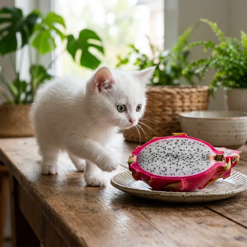 An adorable depiction of a kitten, with soft white fur, its curious green eyes wide open. The kitten is playfully tiptoeing around a brightly colored Pitahaya (also known as Dragon fruit), which is a unique tropical fruit with a vibrant pink outer shell and a fresh white interior filled with tiny black seeds.