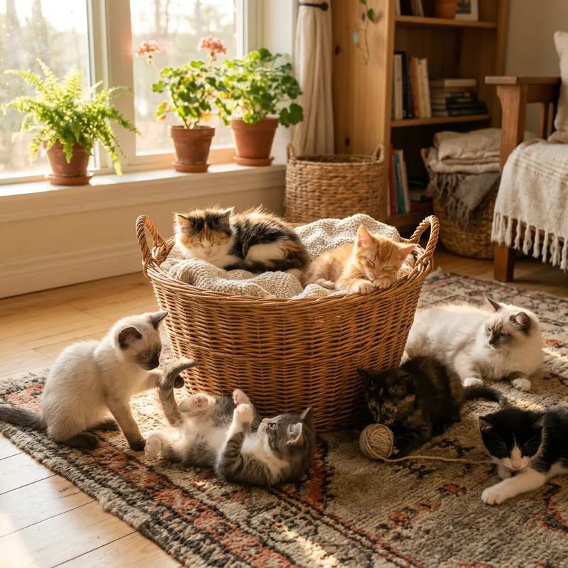A photography of multiple adorable kittens of diverse breeds lazily idling around a cozy woven basket. Sunlight floods the room, casting long, beautiful shadows and illuminating their fur with a warm, golden hue. A variety of kitten antics are on display: some are playfully batting at each other's tails, while others are comfortably snoozing, their paws twitching in their sleep.