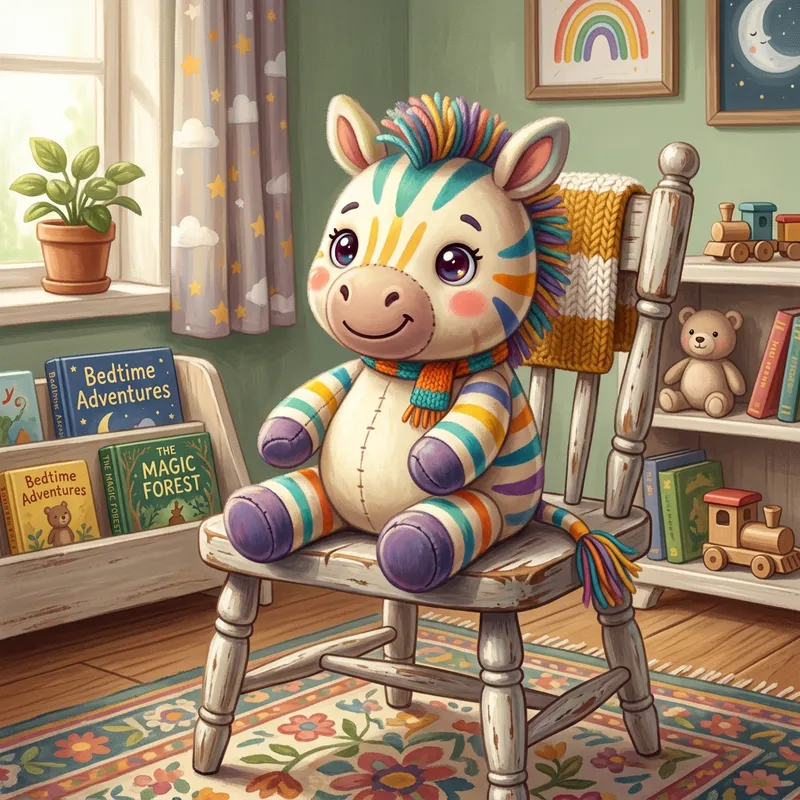 An adorable plush zebra character sitting on a wooden chair. The zebra is styled in bright, cheerful colors, with soft shadows. It has a playful expression on its face and oversized eyes. The scene is set in a cozy indoor setting, with the image done in a digital painting style featuring smooth brushwork and intricate textures. It resembles a whimsical children's illustration.