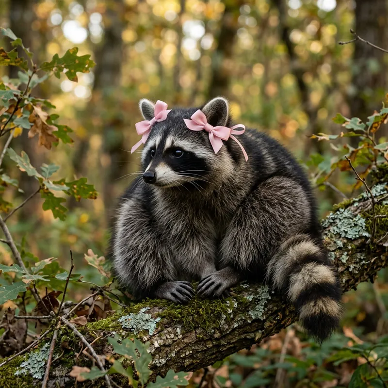 An adorable raccoon featuring black and gray fur, distinctive black-masked eyes, and bushy tail. The raccoon has beautiful pink bows adorning its ears, adding a touch of softness to its otherwise wild aesthetics. It seems peaceful, curiously gazing into the distance.