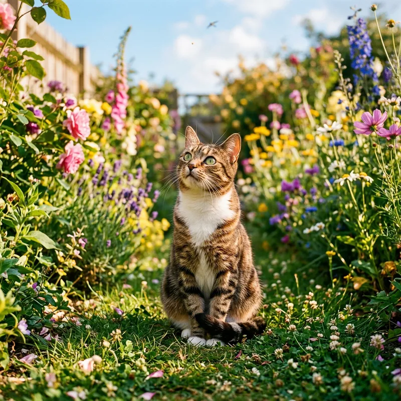 An adorable short-haired domestic cat with bright green eyes, sitting in the mid of a lush garden with colorful blooms all around. Its fur is a rich blend of browns and whites, blending perfectly in the surroundings, and its tail is playfully curled around its feet. The cat is gazing towards the sky with eyes full of curiosity like it's seeing a bird flying high, ready to spring up and chase it anytime. The sun is shining brightly, casting a beautiful golden glow on everything, making the scene serene and picturesque.
