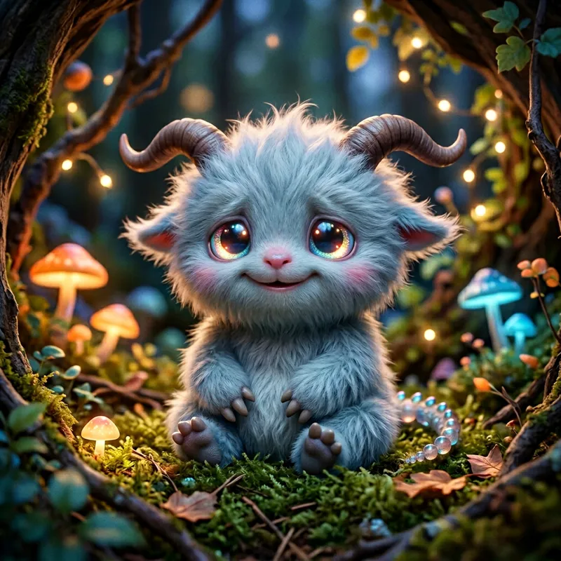 Create an image of a small monster. This timid creature has bright, sparkling eyes that almost glow in the dark, with a body covered in fine, fluffy hair. Its adorable little claws are non-threatening. It has horns that curve backward and a small, beady tail. Despite its monster-like features, its radiant smile and playful demeanor make it more charming than menacing.