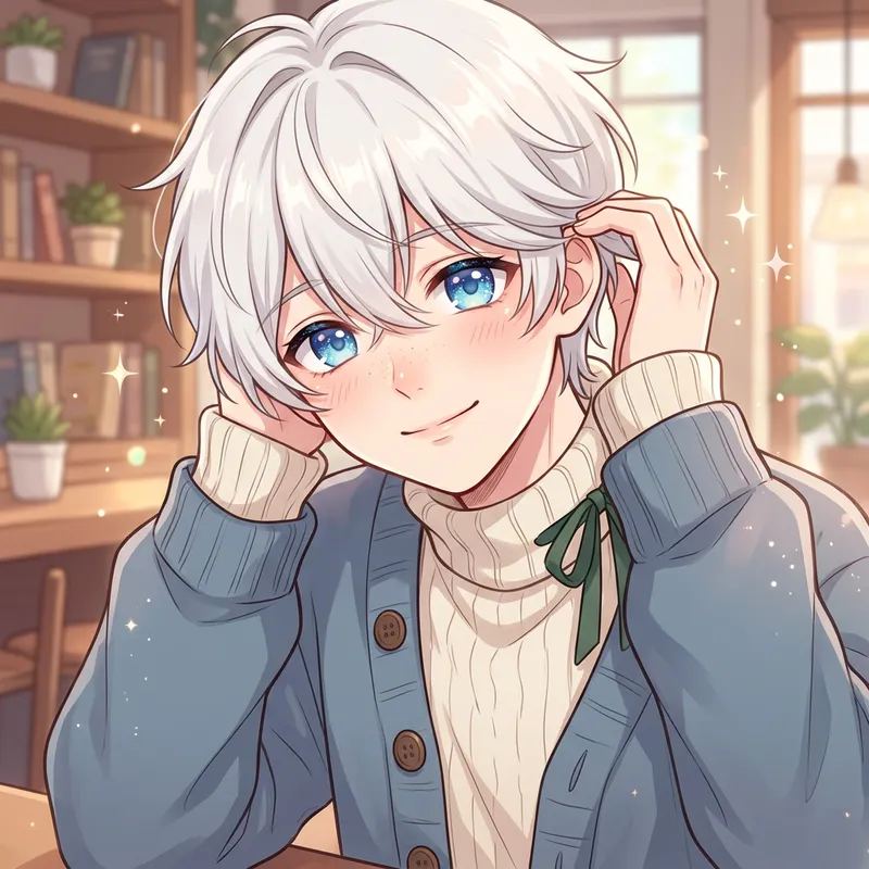 A charming anime style character with an enchanting expression. He has white hair styled neatly and big sparkly blue eyes with a hint of innocence. He exhibits an irresistibly adorable aura.