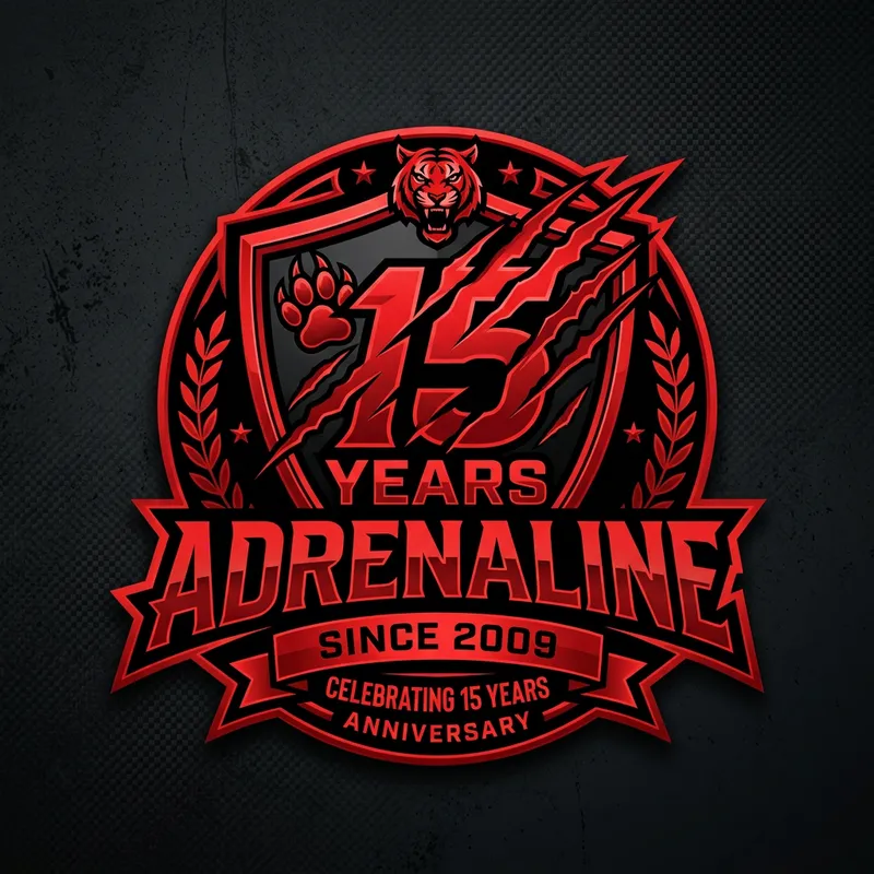 Create a commemorative logo for a team's 15th anniversary. The logo must include the inscription 'Adrenaline' prominently displayed. The milestone occasion of 15 years should be creatively incorporated into the design. Incorporate a tiger's paw or tiger claw marks into the graphic element of the logo. The colour scheme should be strictly red and black.