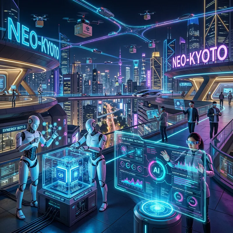 Visualize a state-of-the-art, futuristic setting where advanced artificial intelligence technologies are at play. It encompasses sleek, innovative devices, AI-powered robots performing intricate tasks, highly interactive holographic displays, and quantum computers working at unprecedented speeds. Think of cutting-edge systems, like autonomous bots monitoring and managing complex systems, to various wireless gadgets communicating via a hyper-fast network. Also, instance unmanned drones zooming by, delivering packages, while virtual and augmented reality interfaces pervade daily life. The color palette is vibrant and cool, with lots of neon lights and a backdrop of a high-tech cityscape.