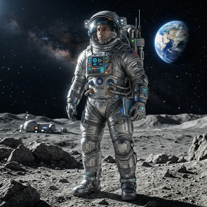 An incredibly advanced astronaut suit. The design pays attention to detail with highly sophisticated technology integrated into its make-up. The suit is silver-grey in color, with reflective metallic surfaces denoting its high-tech materials. It boasts a large, glass-encased helmet allowing a wide field of visual access. The suit's chest region houses a complex control panel with glowing indicators. The gloves are articulately designed for precision and mobility, and the boots are sturdy yet light. Overall, the suit reflects a futuristic outlook on space exploration, embodying cutting-edge advancements in space technology.