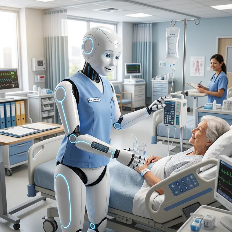 Imagine a scene depicting a highly advanced robotic nurse with humanoid features. The robot nurse has a glossy white exterior, illuminated with soft blue LED lights running along the seams of its structure. It is performing various nursing duties with precision and care. Its image exudes warmth and accessibility, offsetting the cold, inanimate nature commonly associated with machinery. It operates in a clean, well-lit healthcare environment, filled with various pieces of medical equipment. Its streamlined design is inspired by modern concepts of futurism and boasts remarkable functionality and ease of use.