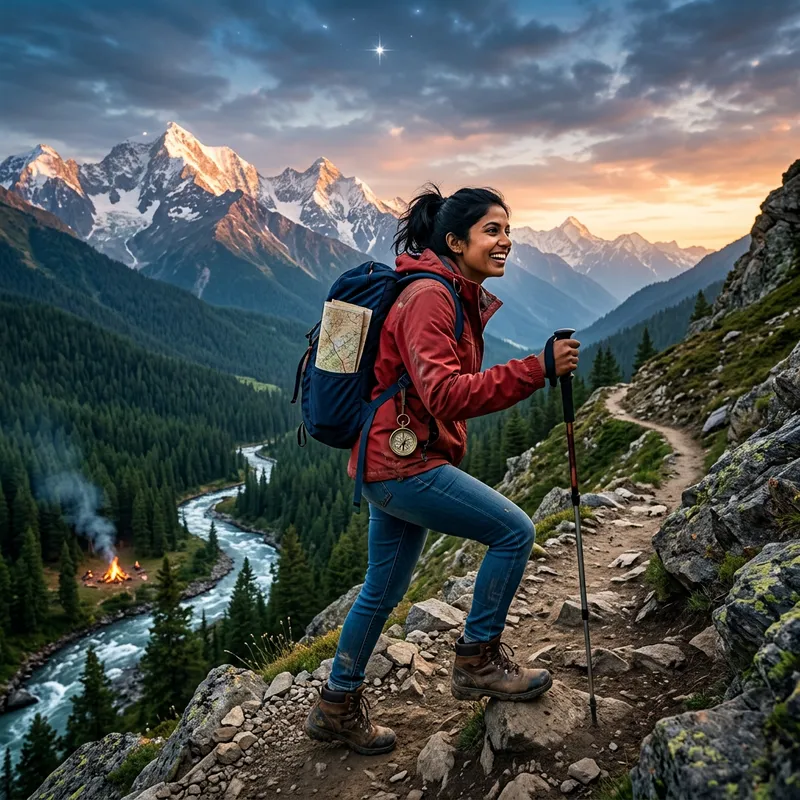 Create an adventurous and dynamic image for a friend's birthday card. The theme should embody the essence of adventure, featuring a majestic landscape with towering mountains, roaring rivers, and deep green forests. Include symbols of adventure such as an antique compass, a weathered map, hiking boots, a campfire, and a shining star overhead. The central character should be a South-Asian woman, energetically climbing a mountain, exuding determination and courage. Her black hair elegantly tied in a ponytail, wearing a red jacket, blue jeans, and a pair of sturdy hiking boots.