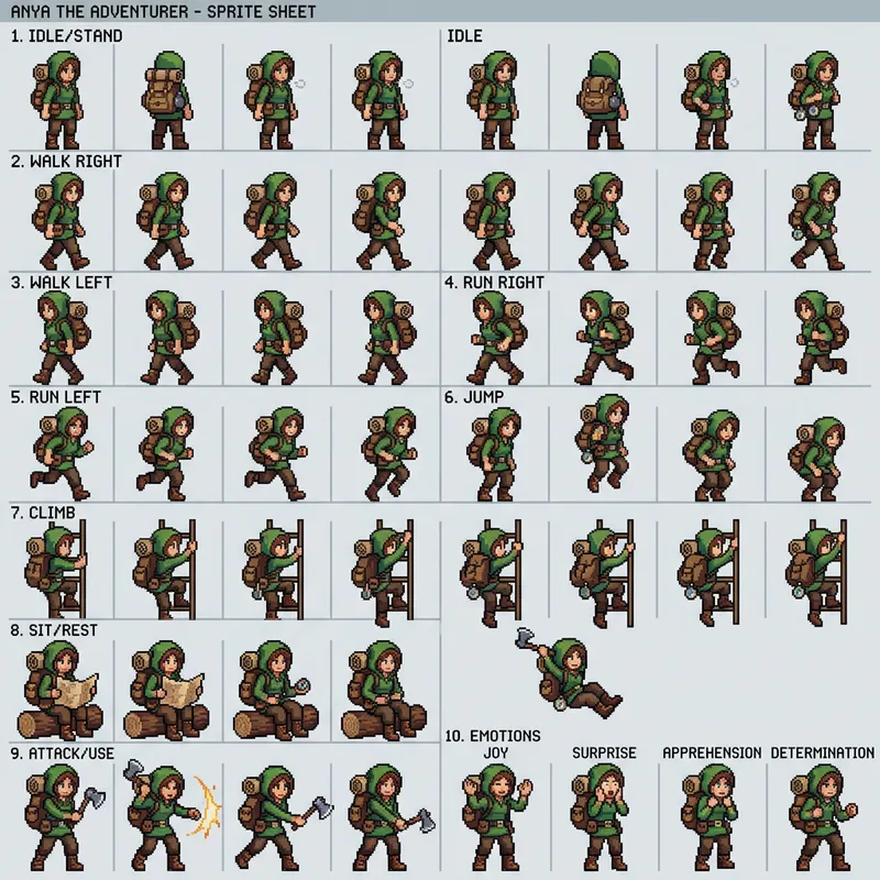Generate a detailed pixel art character sprite sheet. The character should be an adventurer, equipped with outdoor survival gear like a backpack, boots, compass, and map. The sprite sheet should encompass an array of poses and actions, such as walking, jumping, climbing, sitting, and various expressive emotional states such as joy, surprise, apprehension, and determination.