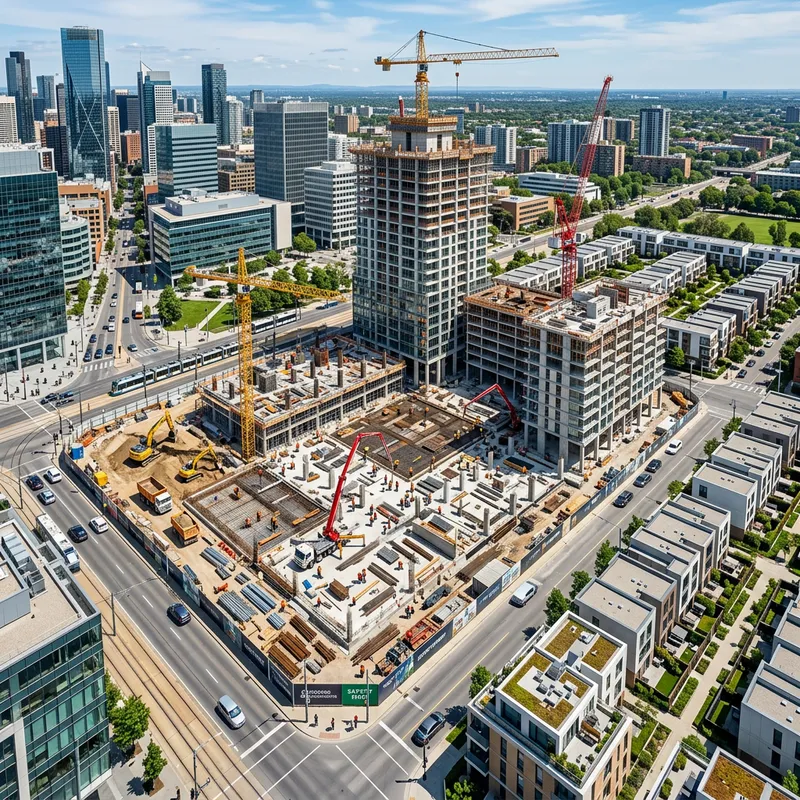 Craft an aerial visual representation of a modern construction site teeming with activity. The depiction should offer a perspective akin to architectural photography with vibrant hues and crisp geometrical lines emphasizing the meticulous nature of the construction process. The shot, taken as if from a high-definition drone camera, should encompass a juxtaposition of city structures and domestic residences within the same architectural genre.