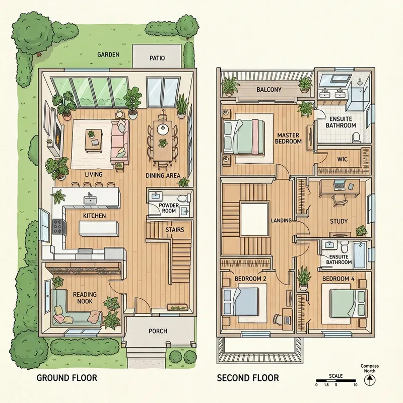 Create an aesthetic floor plan of a two-story house. The ground floor contains a large living room, a kitchen with modern appliances, and a formal dining area. The second floor consists of three bedrooms with attached bathrooms and a study room. The furniture is stylish and minimalist. The color scheme is soothing pastel tones. There should be large windows for natural lighting and green plants scattered across the rooms for a touch of nature. The floor is wooden and the walls are painted in light shades. The overall layout should be open and spacious yet cozy.