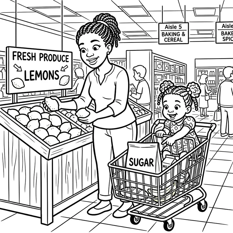 A coloring book page featuring an African American toddler girl with her mother in a grocery store. The mother is selecting lemons from a fruit stand, and the child is pointing at a lone sugar bag in the shopping cart. The drawing utilizes a cartoon style, defined by thick outlines and simplicity in design. The visual narrative is solely in black and white, with no hints of grayscale, echoing the aesthetics of an old-fashioned comic book page.