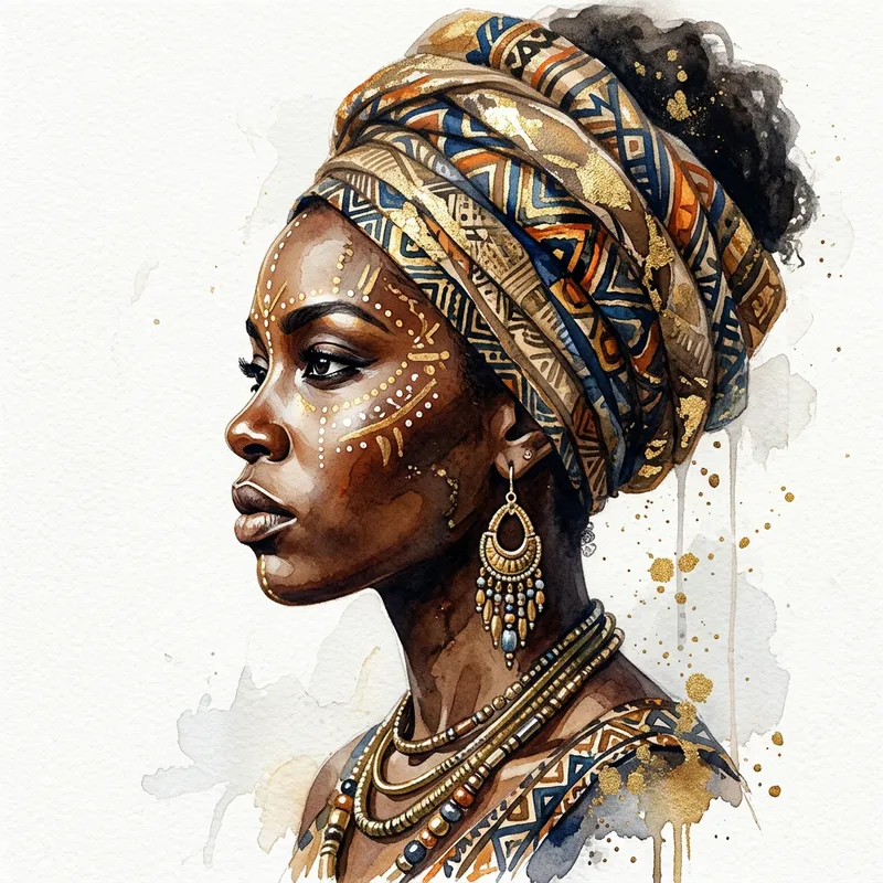 mdjrny-v4 style watercolor painting, portrait of an afro american woman, tribal make up, fashionable head wrap high details painting, realistic painting, watercolor, gold on white, side profile, looking away, serious eyes, 50mm portrait painting, hard rim lighting painting, white background, 8k --ar 2:3