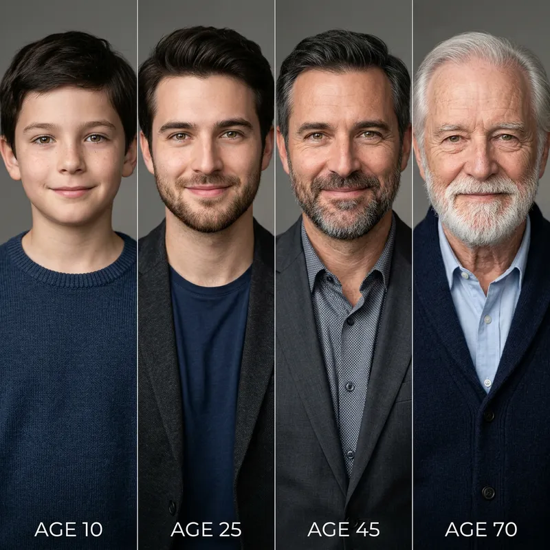 Age progression portrait of the same person at ages 10, 25, 45, and 70, consistent facial features, photorealistic, studio lighting, neutral background.