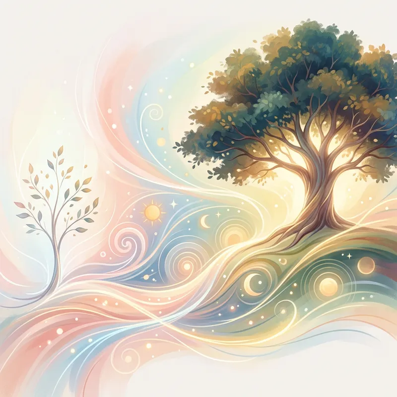 An abstract depiction of an age verification process, ideally represented as a metaphorical transition from a young tree to a mature tree, emphasizing growth and the passing of time. The image does not contain any personal information or actual ID cards. The image ideally has a soft, graceful color palette with gentle transitions from light to dark colors.